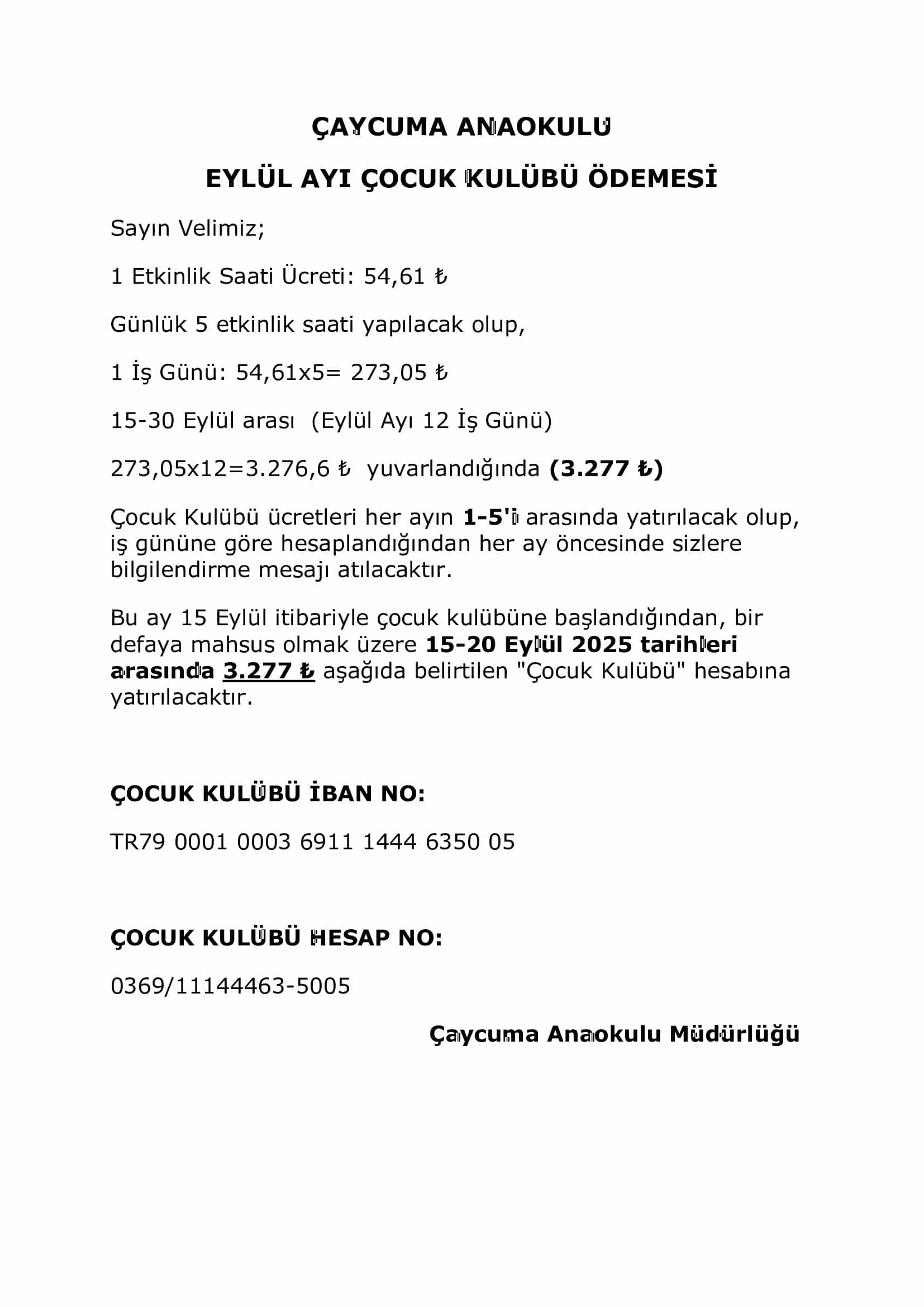 ÇOCUK KULÜBÜ EYLÜL AYI ÜCRETİ
